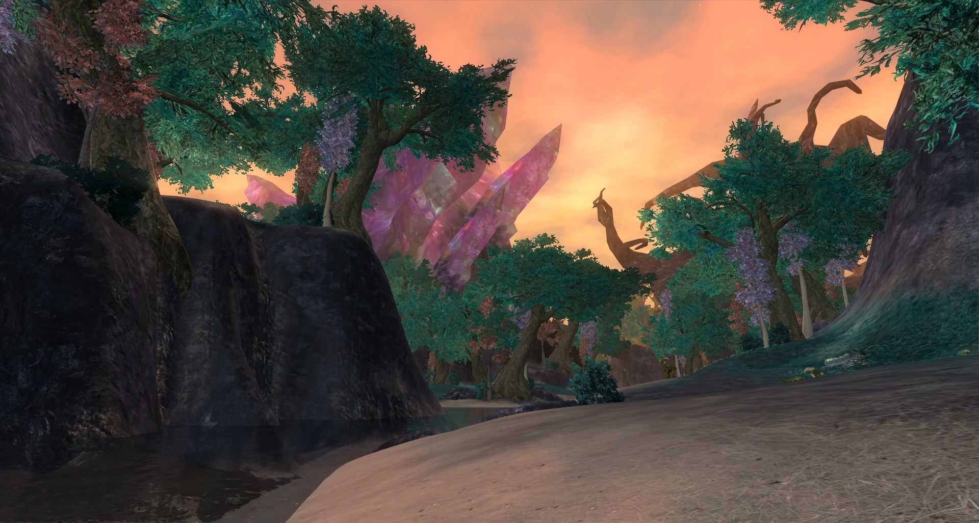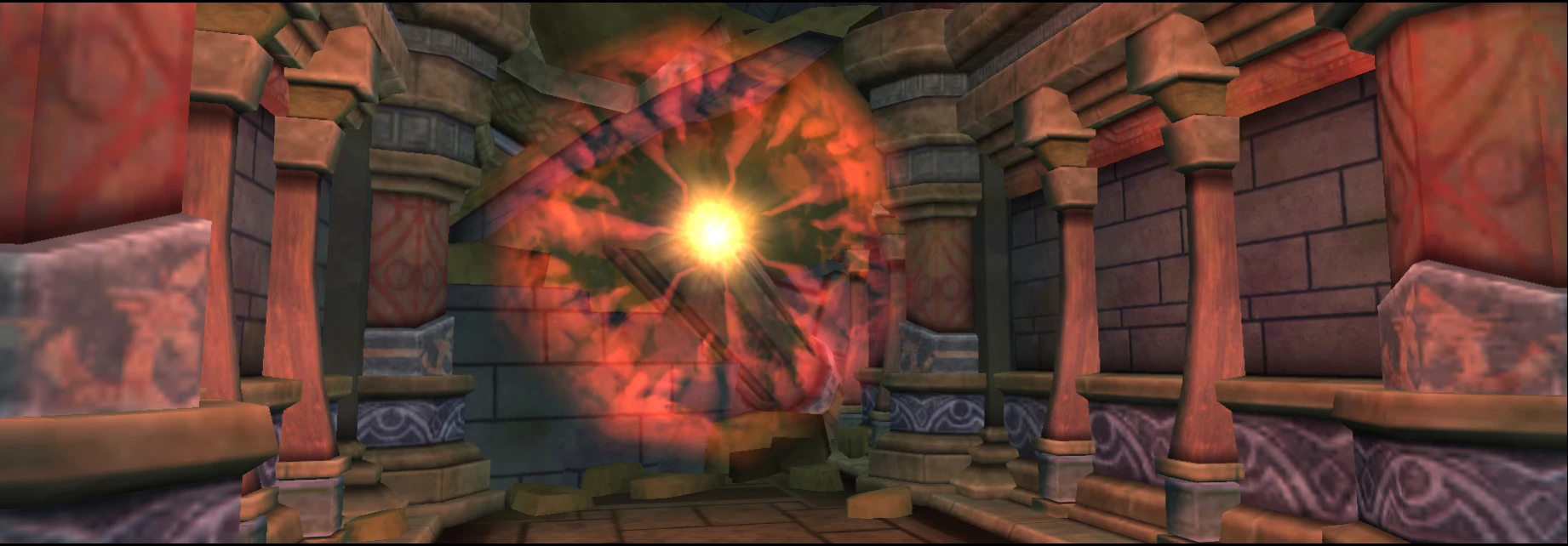 red glowing ball portal, hidden behind rocks and colomns in the tunnel to Fordel Midst