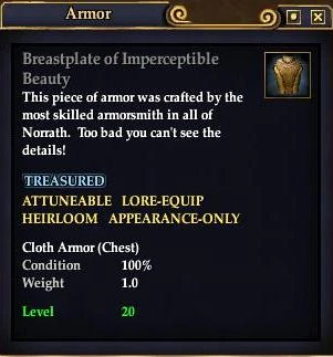Breastplate of Imperceptible Beauty This piece of armor was crafted by the most skilled armorsmith in all of Norrath. Too bad you can't see the details!
