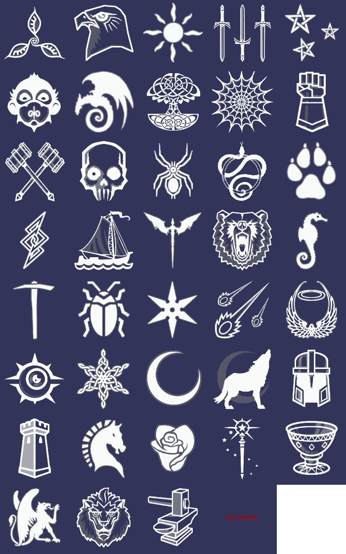 - Emblems consist of over three dozen symbols such as dragons, a spiderweb, swords, and more.