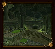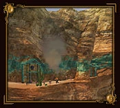 The orcs are starting to use this area as the basis for building their new empire. They have ripped through the layers of sandstone and have begun creating a natural fortress for their long-term plans on Norrath. The largest quarry on Ro exists here and the orcs are pulling raw chunks of stone for use in constructing fortress Rujark and their eventual war effort. Other needed materials are being shipped in from the Isle of Zek, the Orcish Wastes by the Deathfist orcs. There is an abundance of wood and lumber from these shipments and this is reflected by use in the bridges, furniture, ballista, and the more elaborate interior walls for the entire structure.