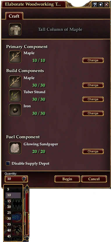 Once you have this ability, a new element is added to the tradeskill window. After you select the item you want to mass produce and click Create, a drop-down arrow labeled Quantity appears on the bottom left side of the tradeskill window.
