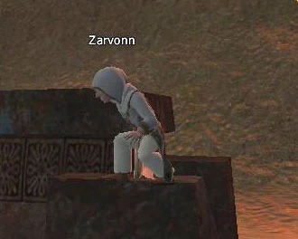 The table now contains Zarvonn's Creation, non-attackable. Zarvonn himself makes his appearance at this point, threatens you and then activates his creation to attack you. Once the creation is killed, Zarvonn rushes away to the end of the passageway in the zone and disappears. Use the teleportation rock at the top of the tower where you came in to get back to The Commonlands.